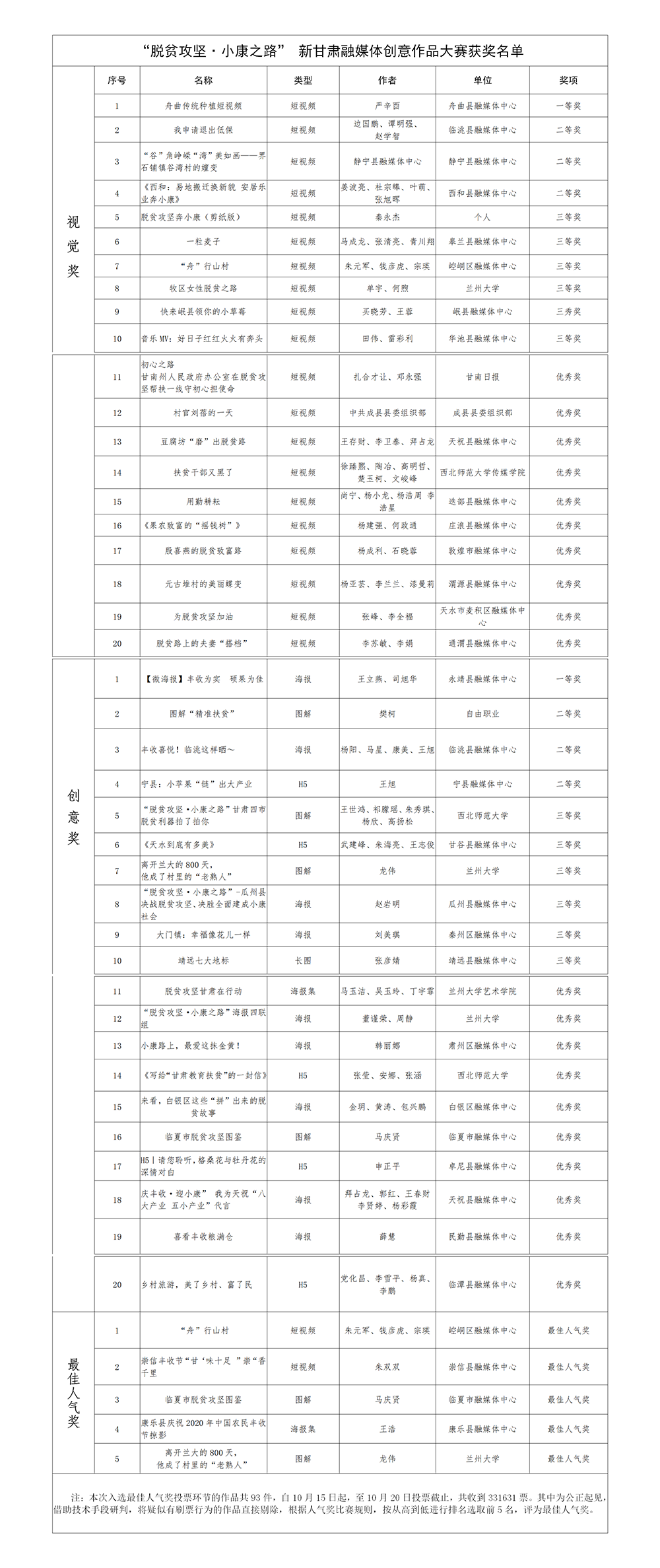 “脱贫攻坚·小康之路”新甘肃融媒体创意作品大赛经过大赛组委会复评,40件作品分别获得一二三等奖及优秀奖。经过网友的投票,5名最佳人气奖也新鲜出炉。