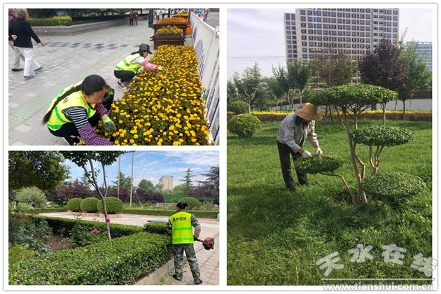 修剪花草树木美街景。在全面完成春季绿化各项工作任务的基础上,抓日常养护、抓隐患排除,修剪美化城区各路段绿化带约20万平方米,更换城区主次干道沿线花坛及藉河城区段沿岸桥梁上缺失、枯败的草花15万盆。针对汛期暴雨大风极易造成树枝断裂坠落事故的问题,修剪、清理藉河北路、藉河南路、自由路、共和巷等路段死树危树40余株,巩固和提升城区绿化美化工作成效。