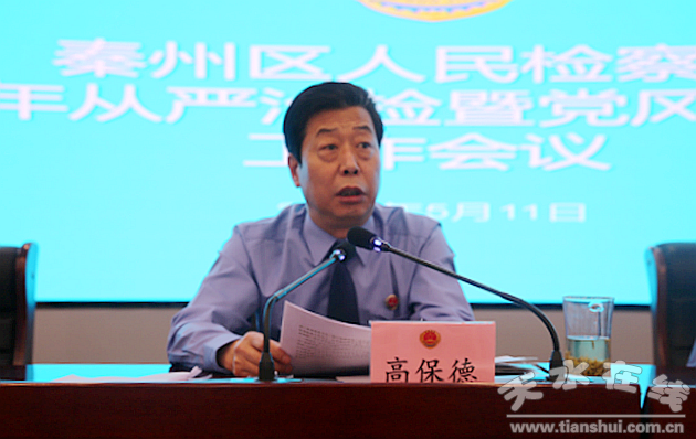 其次,院党组书记、检察长高保德作了讲话。他要求全院干警以习近平新时代中国特色社会主义思想为指导,深入学习贯彻党的十九大和习近平总书记系列重要讲话精神,全面贯彻落实中央纪委十九届四次全会、检察机关党风廉政建设工作部署要求,不忘初心、牢记使命,努力推动全面从严治党从严治检取得新的成效,为全面履行新时代法律监督职责提供坚强保障。