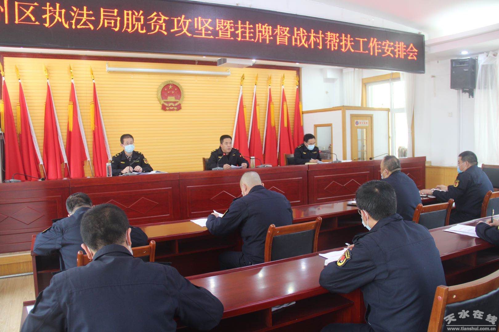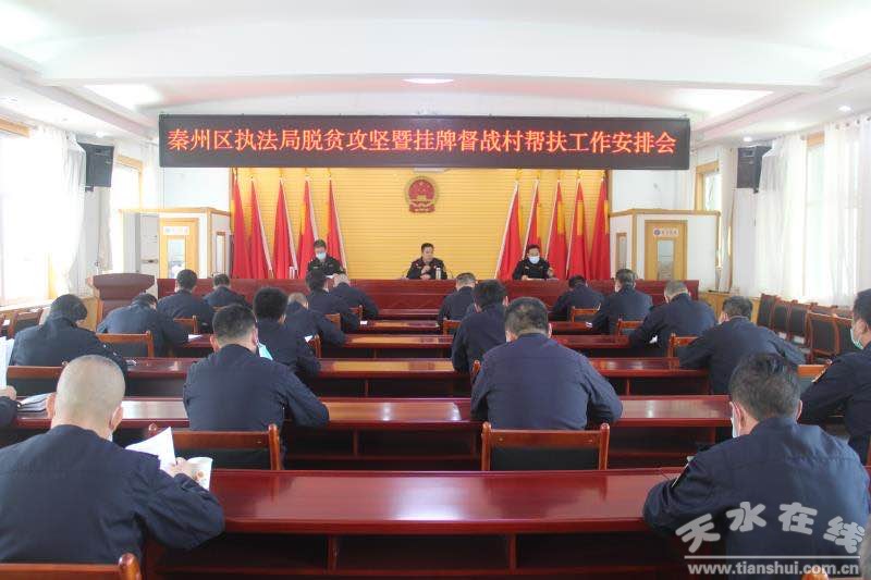 3月20日,秦州区执法局召开脱贫攻坚暨挂牌督战村帮扶工作安排会议,会上领学了习近平总书记关于扶贫工作重要论述和疫情防控重要讲话、指示精神,传达了中央和省、市、区关于加强帮扶工作的部署要求,宣读了《全局挂牌督战村帮扶工作实施方案》,并对近期帮扶重点工作进行了专题安排部署。