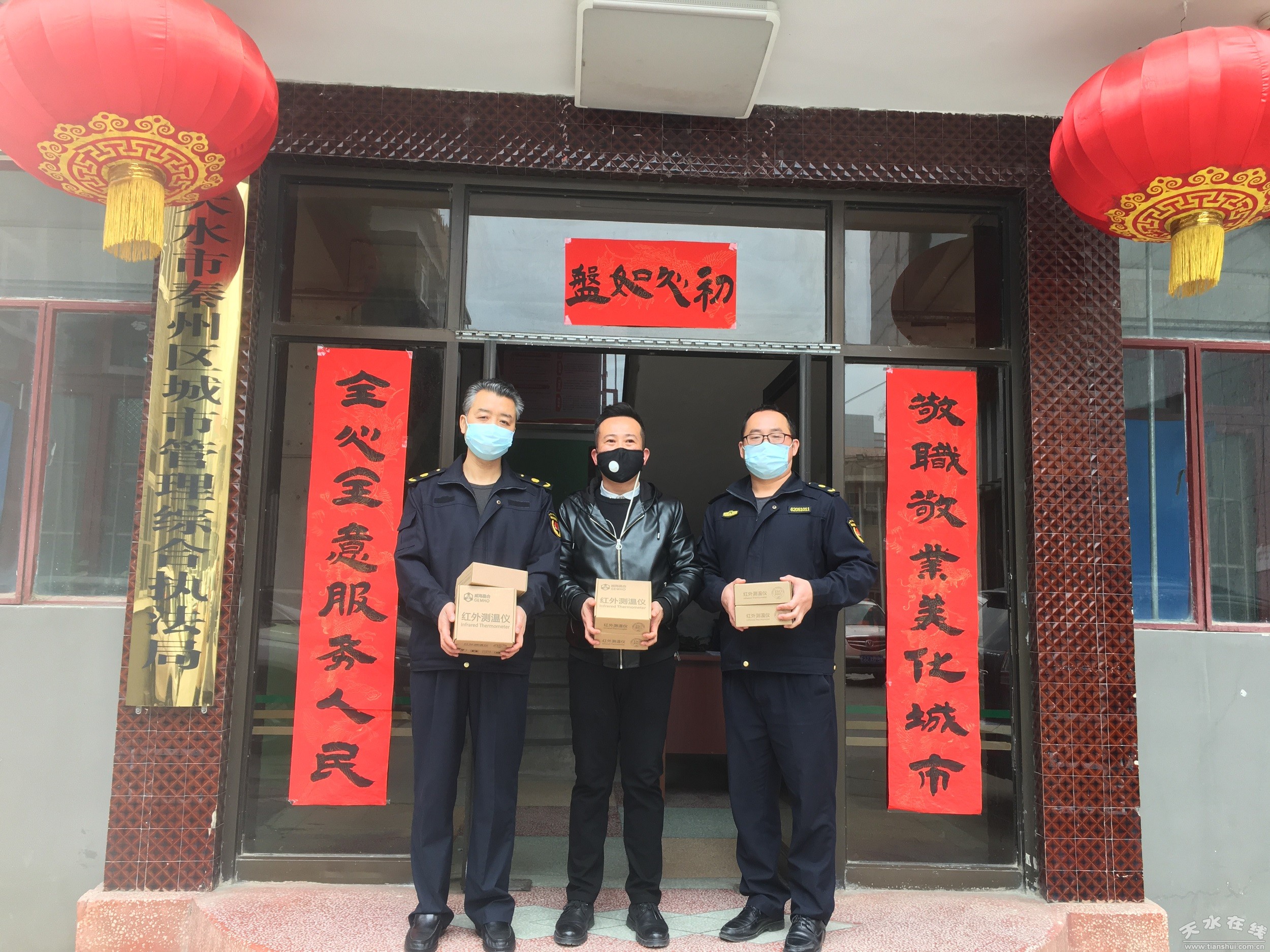 城管一线执法队员的防护也牵动着爱心企业的深情关注,连日来,中国联通天水市分公司、天水宝康医药连锁有限公司为执法人员捐赠了疫情防控急需用的红外线测温仪、常用各种感冒药、84消毒液、防护手套等价值26060元的物资,突解了广大一线执法队员的燃眉之急,他们无私热心的捐赠,既是“及时雨”,又是“振奋剂”,彰显了企业的社会责任与担当,体现了对城市管理者的关怀、厚爱,显现了对城管工作的理解和支持。执法队员备受鼓舞,大家纷纷表示:在今后的工作中,将不负广大群众和爱心企业的期望,更加履职尽责多奉献、不辱使命勇担当,为坚决打赢新型冠状病毒感染的肺炎疫情攻坚战筑牢防疫抗疫的铜墙铁壁。