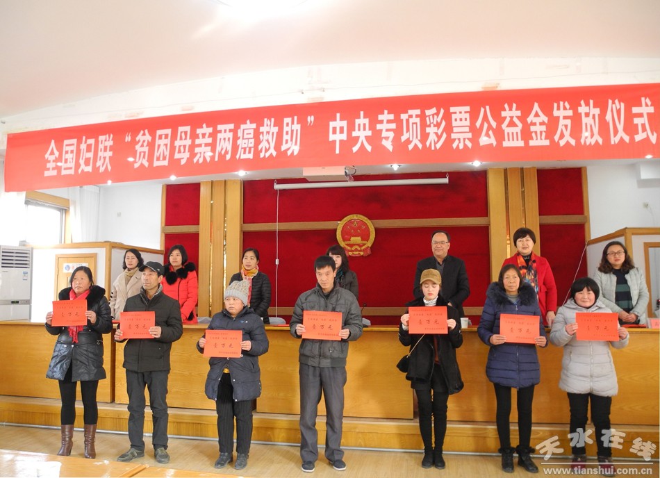 秦州区妇联近日,秦州区妇联举行了“贫困母亲两癌救助专项基金”发放仪式,为来自秦州区玉泉、太京、皂郊、藉口、平南等镇的22名“两癌”贫困患病妇女发放了救助金22万元。市妇联主席何忠兰,区人大常委会副主任伏承祥,区政协副主席郭金霞出席发放仪式。