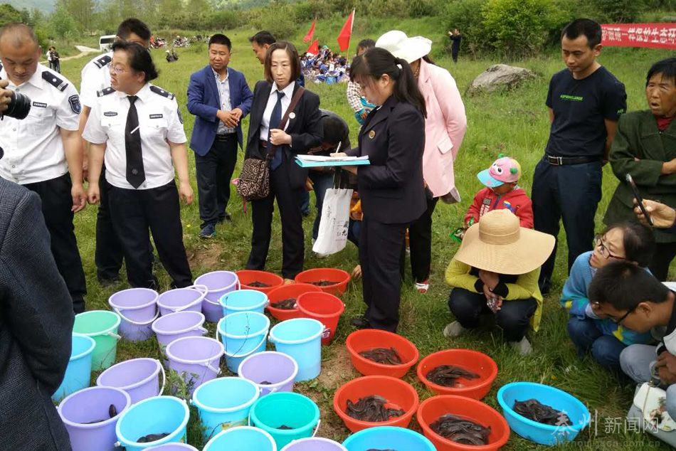 在公证人员的现场监督下,5月19日启动仪式当天,在花园河放流大鲵苗种500尾。之后自5月23日至25日,公证人员全程跟随苗种运输车辆相继前往庙川河、北峪河、螃蟹河、响潭河等河段进行增殖放流。对每一批次的大鲵放流,公证人员从苗种确认、清点、装车、运输、放流等各个环节,都从严按照相关程序要求,监督工作人员保质保量将大鲵苗种放流到指定河段。