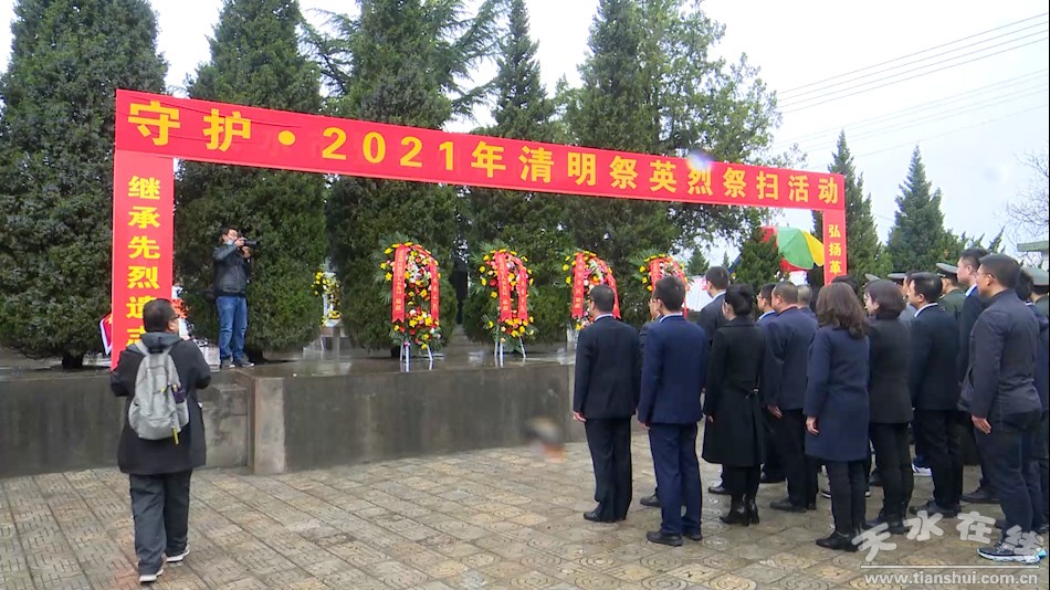 在烈士陵园,天水市军分区、天水市退役军人事务局、秦州区武装部、秦州区退役军人事务局等多家单位一同举行了“守护·2021清明祭英烈”祭扫活动。