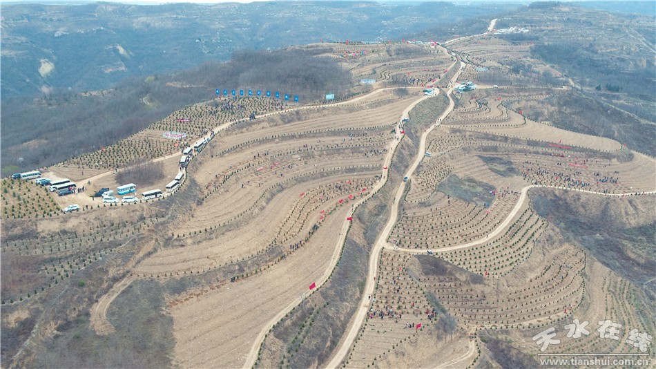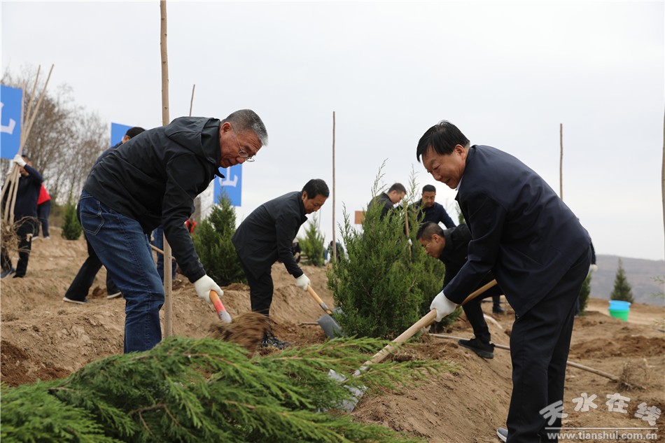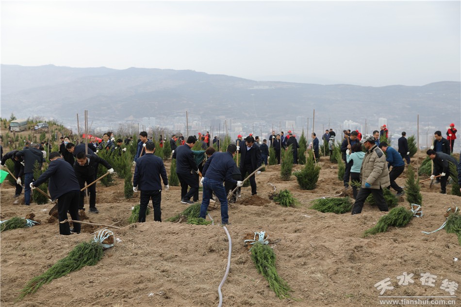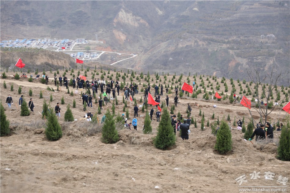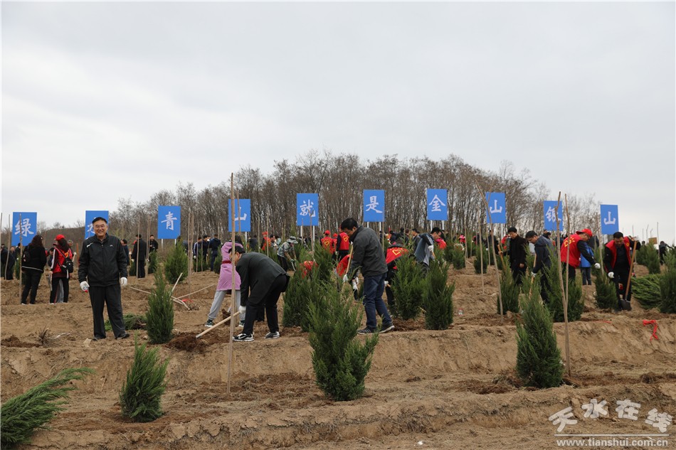在秦州区玉泉镇石马坪村文山梁义务植树基地,党政机关、企事业单位干部职工、部队官兵及预备役人员、青年志愿者一起参加春季义务植树活动,以实际行动为天水再添新绿,号召全市人民积极投身植树造林活动,共建美好绿色家园。