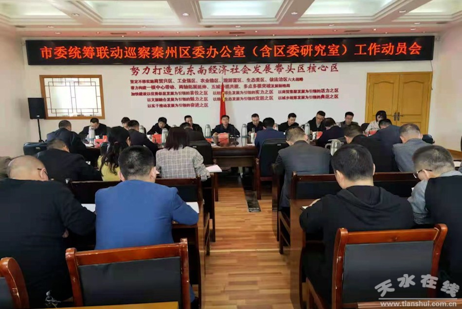 秦州区融媒体中心3月17日讯(记者 张敏)按照市委统一部署安排,3月15日、16日两天,市委统筹联动巡察秦州区委办公室(含区委研究室)、区人大常委会机关党组、区人民政府机关党组、区政协机关党组工作动员会先后召开。秦州区委常委、纪委书记、监委主任、区委巡察工作领导小组常务副组长马利民同志出席会议并作动员讲话,就配合做好巡察工作提出要求。市委第一指导督导组组长、市委巡察办副主任王峰同志及指导督导组有关同志出席会议,区人大常委会副主任、区委第二联动巡查组组长刘书文,邓宝珊将军纪念馆馆长、区委第一联动巡查组组长王金全,分别通报巡察任务安排、提出具体要求,秦州区委第一、第二联动巡察组全体成员、区委巡察办负责人、被巡察单位领导班子成员及全体党员干部职工参加会议。