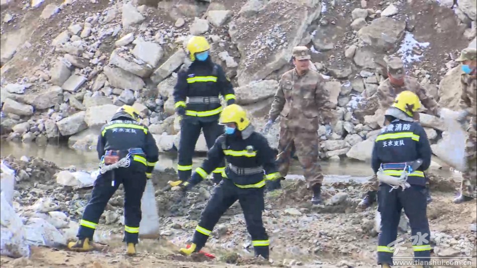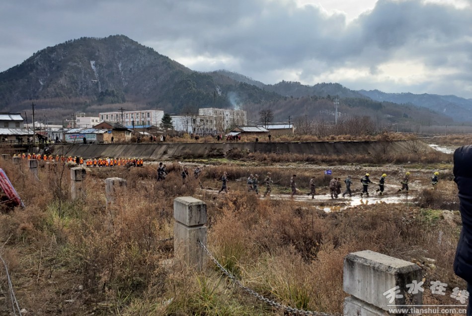 此次演练是模拟现场位于娘娘坝镇甘肃省天水李子金矿有限公司尾矿干堆场,因山洪造成坝坡局部塌方,尾砂泄露,进入河流,对周边村庄造成污染。