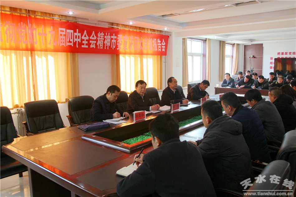 秦州区融媒体中心12月22日讯 (记者 杨旭)12月21日,天水市委宣讲团成员、市委常委、秦州区委书记雷鸣赴太京镇宣讲党的十九届四中全会精神。他强调,广大干部群众要把思想和行动统一到全会精神上来,把学习宣传贯彻全会精神与当前脱贫攻坚重点工作结合起来,将学习全会精神激发出来的热情干劲转化为坚决打赢脱贫攻坚战,高质量、零误差、无遗漏实现整区脱贫摘帽的具体行动和过硬措施,为党和人民交出一份满意答卷。