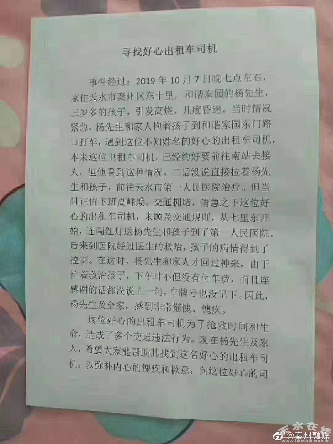 10月7日晚七点左右,家住秦州区和谐家园的杨先生三岁多的孩子突发高烧,几度昏迷。他和家人抱着孩子在和谐家园东门路口打车时,遇到了一位好心的出租车司机。原本要前往南站接人的出租车司机看到这种情况,二话没说直接载着他和孩子,前往天水市第一人民医院。当时正值下班高峰,交通拥堵,情急之下这位好心的出租车司机,在保证行驶安全的前提下接连驶过数个路口的红灯,将杨先生和孩子到了第一人民医院。到了医院后,司机没有收取车费,只是催促杨先生赶紧去给孩子治病,然后就默默地离开了。