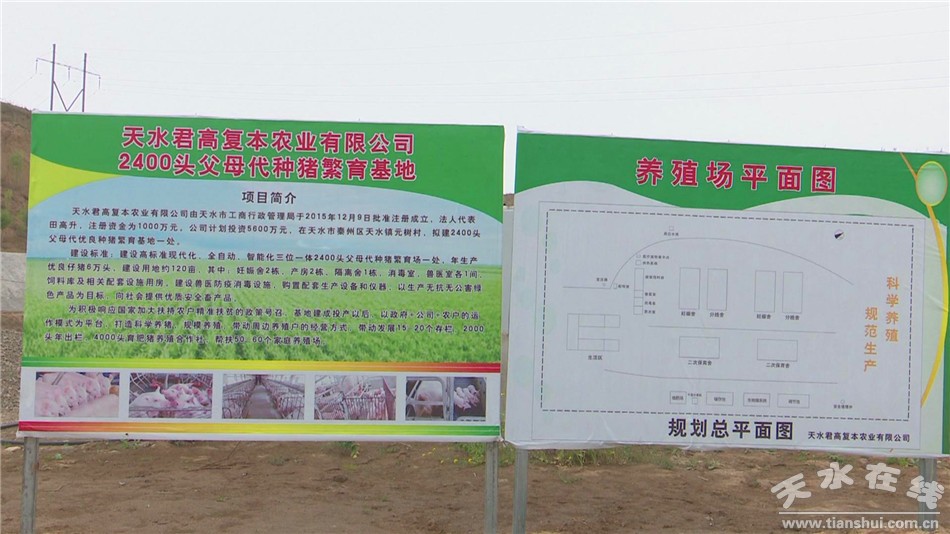 在天水镇元树村,天水君高复本农业有限公司2400头父母代种猪繁育基地将在今年7月建成投产。目前,妊娠舍、产房、隔离舍、消毒室、兽医室、饲料库及相关配套设施用房主体建设已经完成。