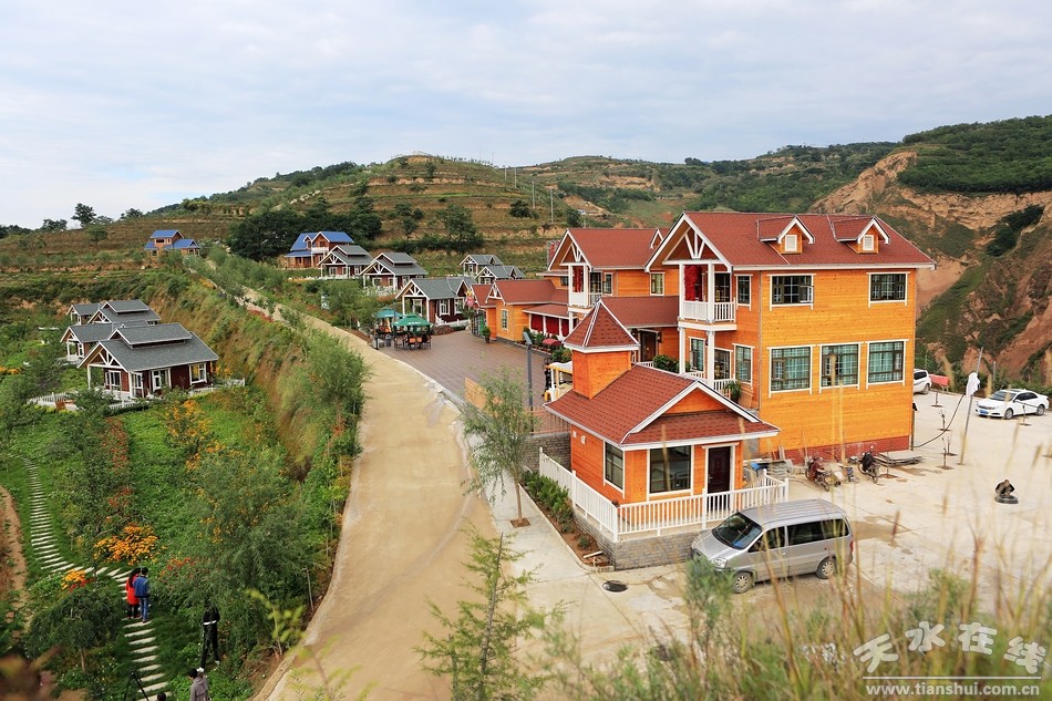 渗金山生态园位于天水十佳名镇——皂郊镇下寨子村,果树研究所,是一家集酒店、餐饮、休闲、观光于一体的生态场所。渗金山生态园是一家高档旅游生态园式酒店,酒店设有别墅套房、标准房间,房内设施舒适齐全。餐饮中心设有各具特色的庭院式餐厅、文化餐厅,宴会共有餐位300余个,汇萃了天水本地菜、粤菜、湘菜及川菜,风味独特,情景宜人;休闲设有垂钓烧烤,棋牌娱乐——渗金山生态园四周