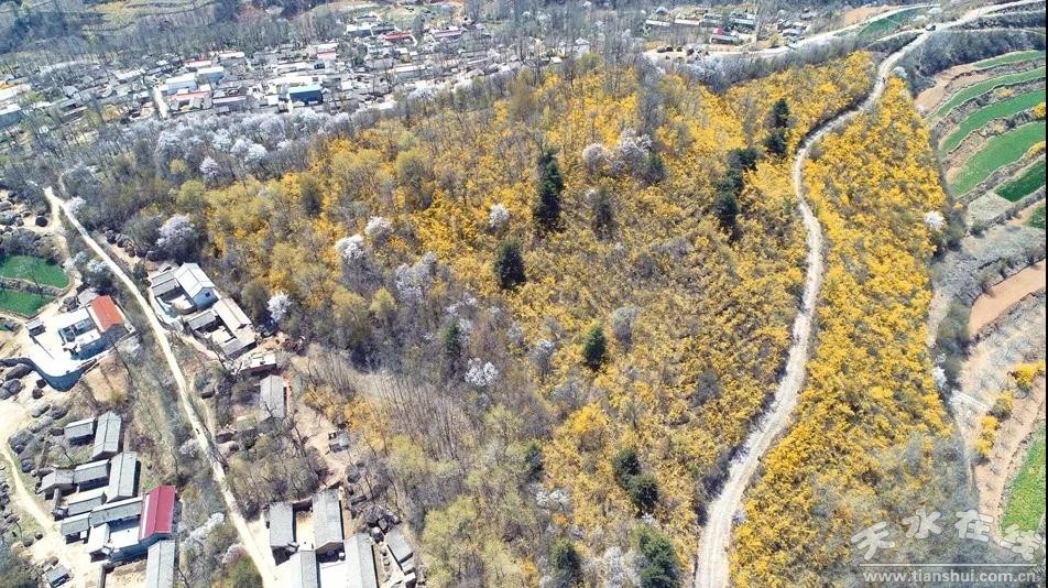 这是4月11日无人机在秦州区秦岭镇拍摄的连翘花丛。(秦州区融媒体中心赵越摄)