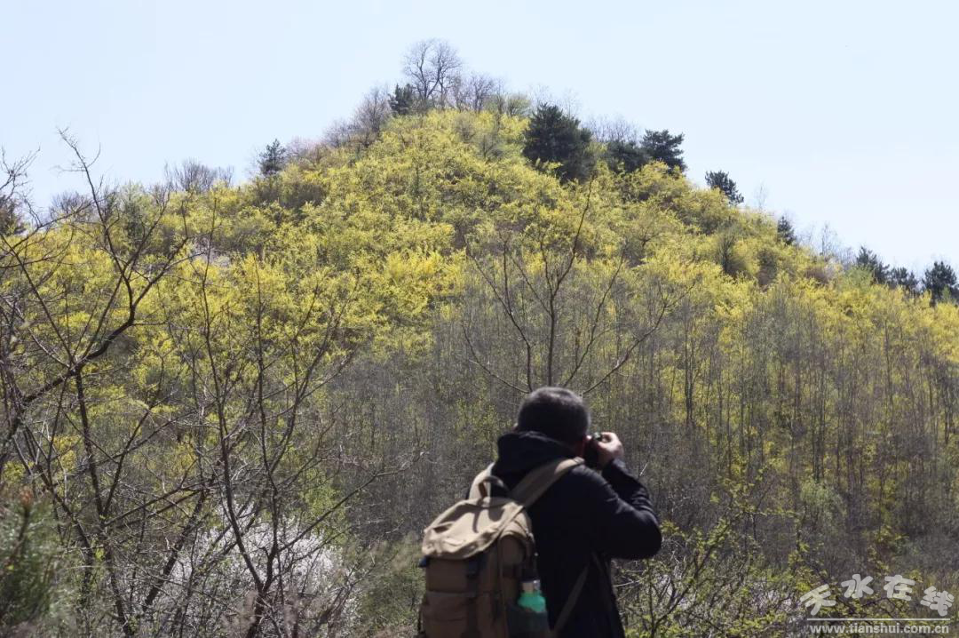 4月11日,一名游客在拍摄秦州区秦岭镇的连翘花丛。(秦州区摄影家协会马晓东摄)