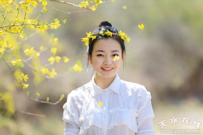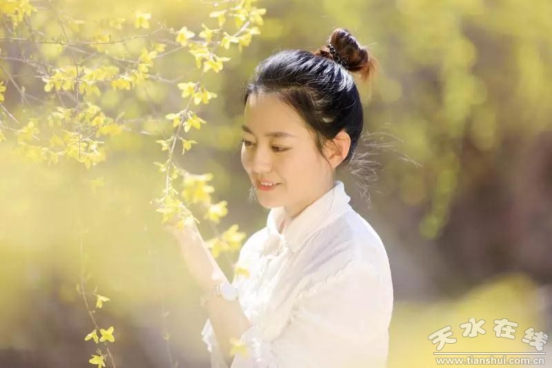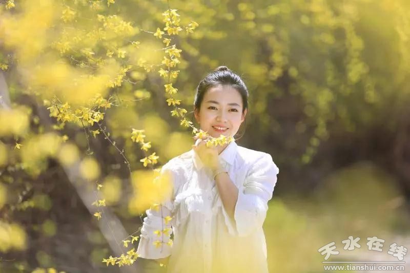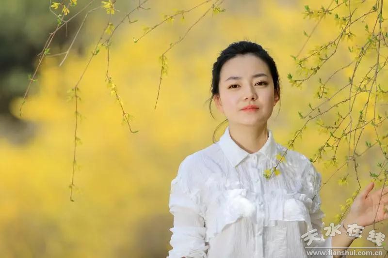 4月11日,一名游客在秦州区秦岭镇的连翘花丛中游玩。(秦州区摄影家协会王诚摄)