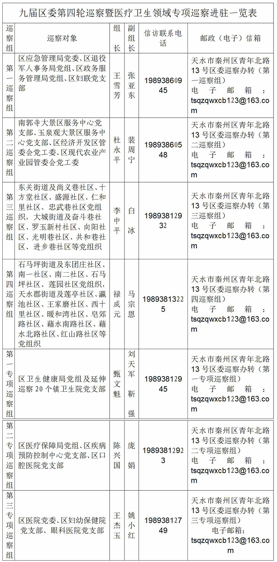 秦州区融媒体中心10月20日讯 根据市委上下联动巡察工作要求和区委统一部署,截止10月19日,九届区委第四轮巡察暨医疗卫生领域专项巡察的7个巡察组完成对区应急管理局、区退役军人事务局、区政务服务管理局、区妇联、区经济开发区管委会、区现代农业产业园管委会、玉泉观大景区服务中心、南郭寺大景区服务中心、东关街道、大城街道、石马坪街道、天水郡街道等四个街道及所辖25个社区、区卫生健康局及20个镇卫生院、区医疗保障局、区人民医院、区疾病预防控制中心、区口腔医院、区妇幼保健院、区眼科医院等党组织全面完成巡察进驻工作。
