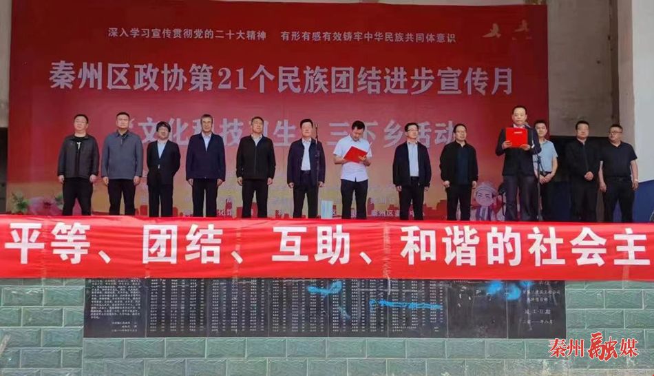 秦州区融媒体中心5月31日讯(记者 赵婷)5月30日,区政协在牡丹镇牡丹村文化广场开展第21个民族团结进步宣传月“文化、科技、卫生”三下乡活动。区政协党组书记、主席毛更生,区政协副主席来君平出席活动。