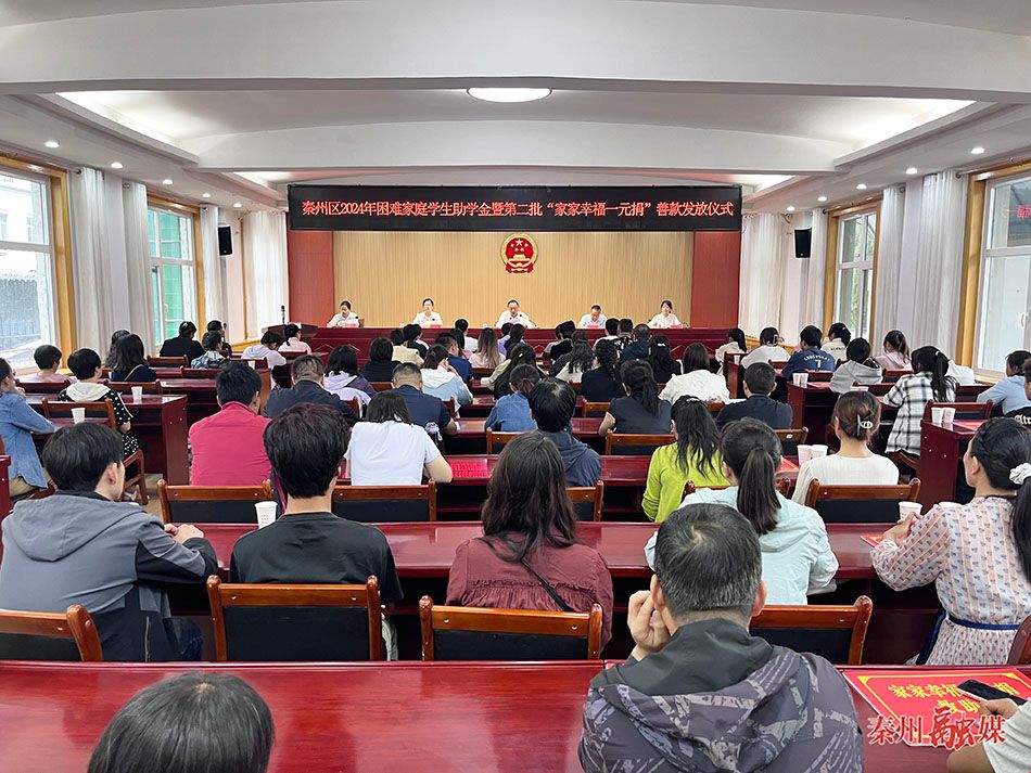 秦州区融媒体中心9月7日讯(记者 张敏)9月6日,秦州区举行2024年困难家庭学生助学金暨第二批“家家幸福一元捐”善款发放仪式。秦州区委副书记冯荣,区人大常委会副主任王煊出席仪式。