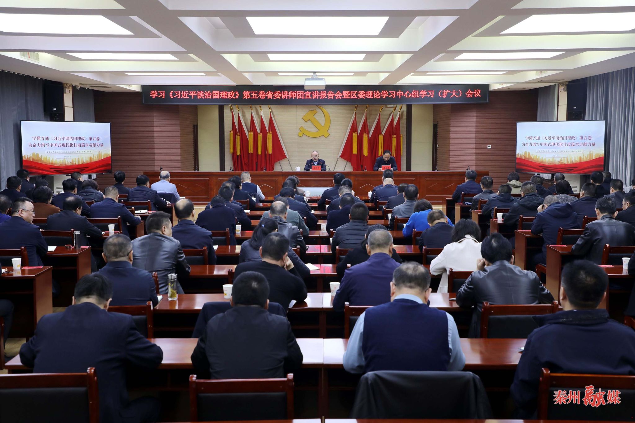 秦州区融媒体中心11月6日讯 (记者 邵千) 11月6日,秦州区召开学习《习近平谈治国理政》第五卷省委讲师团宣讲报告会暨区委理论学习中心组学习(扩大)会议。省委讲师团成员、省政府文史研究馆党组书记、馆长王华存作专题报告。市委常委、区委书记康泰来主持会议并讲话。