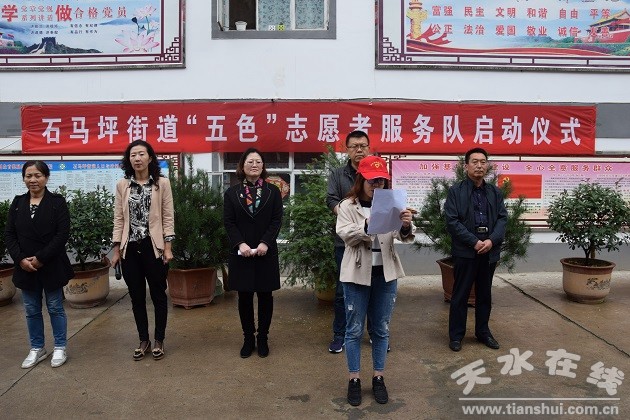 石马坪街道“五色志愿者服务队”即红色党员志愿者服务队、蓝色平安志愿者服务队、绿色环保志愿者服务队、橙色安全志愿者服务队、黄色关爱志愿者服务队。“五色志愿者服务队”以提供平安建设、救助帮扶、环境保护、安全巡查等服务为宗旨,让更多的人参与到志愿服务活动中来,使志愿服务阵地化、活动经常化、管理制度化,打造出一个具有广泛影响力和社会动员力的服务品牌。