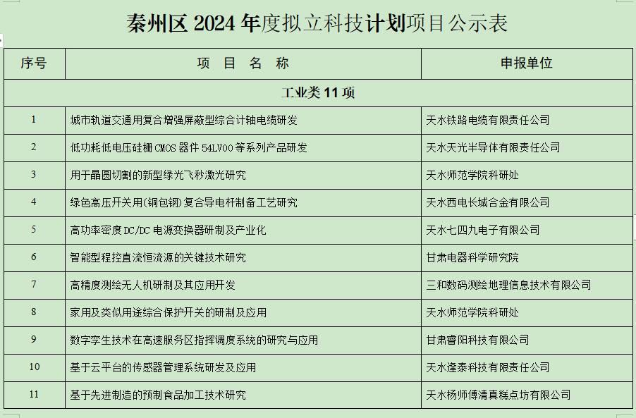 2024年度区级科技计划项目征集工作通过科技项目管理系统进行征集,共征集各类科技项目73项。按照征集要求,对不符合申报条件的项目进行初步审查筛选,对畜牧、卫生、文旅、软科学数量较少的科技项目,按照行业归口管理征求相关部门单位和相关专家意见建议后确定,对工业、民生、农业、林果类的57项采取专家分组答辩评审。通过专家评审打分排名和征求相关行业部门意见,经区科技局党组会议研究决定,2024年度秦州区拟立科技计划项目40项。为体现公开、公正、公平原则,按照《天水市秦州区科技计划项目管理办法》有关规定,对拟立项目予以公示。