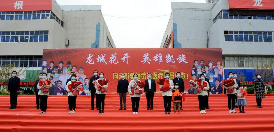 王锐说,面对突如其来的疫情,天水驰援武汉医护人员坚决响应习近平总书记和党中央号召,主动请缨、逆行出征,与武汉人民并肩作战,与新冠病毒正面交锋,不负重托,不辱使命,圆满完成了救治任务。过去的两个多月,你们不顾危险、忘我工作,同时间赛跑、与病魔较量,发扬大爱无疆、医者仁心的崇高精神,克服了很多前所未有的困难,为夺取武汉保卫战、湖北保卫战的胜利作出了重要贡献,展示了天水医护人员良好的精神风貌。你们不愧是新时代最可爱的人,天水人民为你们自豪,以你们为荣!