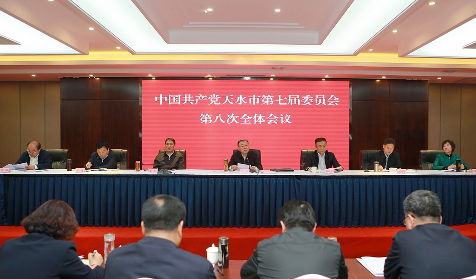 5月17日上午,中国共产党天水市第七届委员会第八次全体会议召开。全会以习近平新时代中国特色社会主义思想为指导,全面贯彻落实习近平总书记视察甘肃重要讲话和“八个着力”重要指示精神、全国两会期间参加甘肃代表团审议时的重要讲话精神,深入学习贯彻习近平总书记在今年省部级主要领导干部专题研讨班和解决“两不愁三保障”突出问题座谈会上的重要讲话精神,传达贯彻省委十三届八次全体会议和省市党政主要领导干部专题研讨班精神,审议通过了《中共天水市委关于贯彻落实〈中共甘肃省委关于深入贯彻落实习近平总书记重要讲话精神加快建设幸福美好新甘肃不断开创富民兴陇新局面的决定〉的意见》,安排部署当前和今后一个时期的工作。